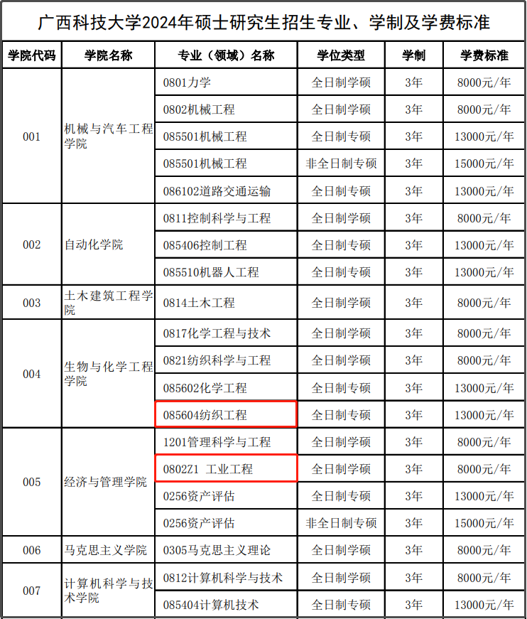 广西科技大学生物与化学工程学院新增085604纺织工程专业;经济与管理学院新增0802Z1 工业工程专业。去年的招生专业目录上并没有这两个专业。