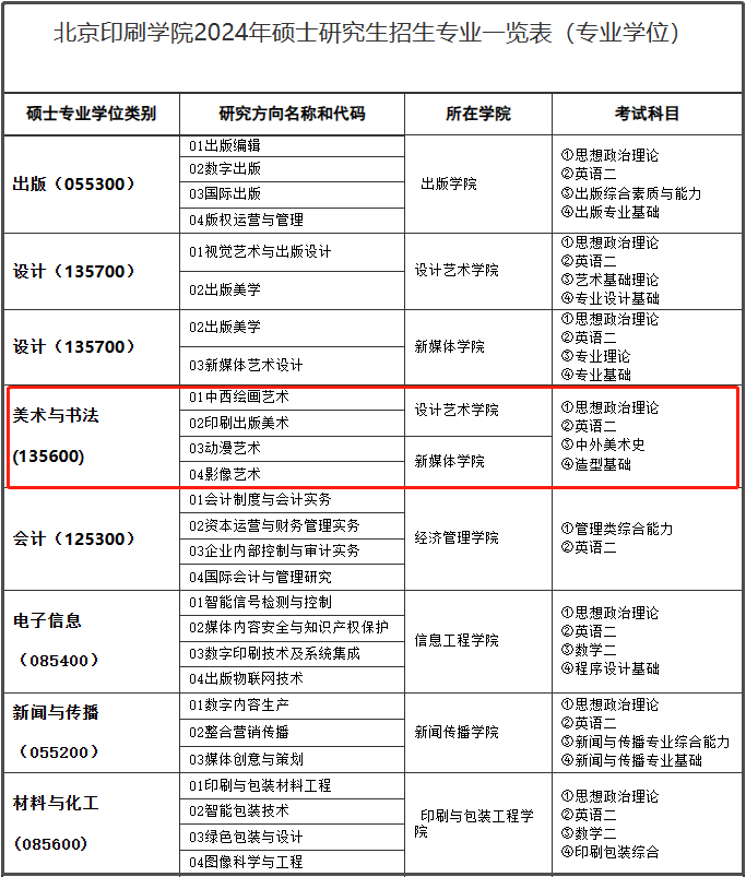 北京印刷学院前两天发布2024年硕士研究生招生专业一览表,与2023年相比,专业学位新增美术与书法(135600)专业;学术学位新增设计学(140300)专业,去年该专业招生代码为130500。