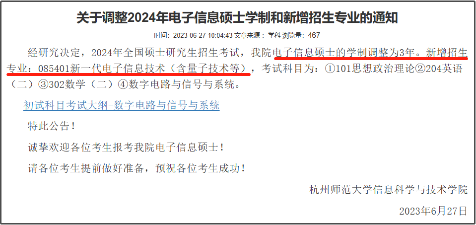 新增招生专业:085401新一代电子信息技术(含量子技术等),考试科目为:①101思想政治理论②204英语(二)③302数学(二)④数字电路与信号与系统。