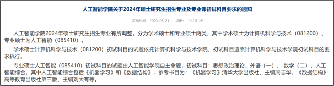 吉林大学人工智能学院新增人工智能专硕(085410),初试科目试题为学院自主命题。