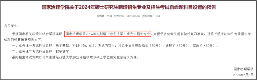 中南财经政法大学国家治理学院2024年拟新增“数字法学”研究生招生专业。