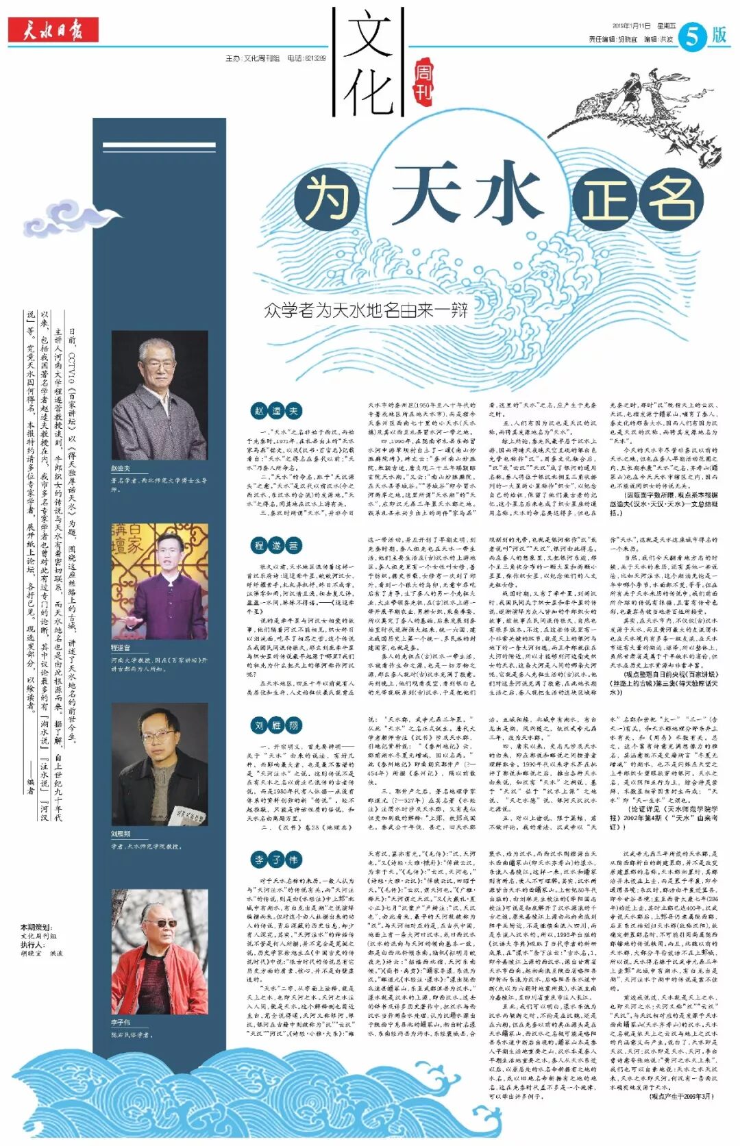 主讲人河南大学程遂营教授谈到,牛郎织女的传说与天水有着密切联系,而天水地名也是由此根源而来。据了解,自上世纪九十年代以来,包括我国著名学者赵逵夫教授在内,我市多名专家学者也曾对此有过专门的论断,其中议论最多的有“湖水说”“注水说”“河汉说”等。究竟天水因何得名,我们特约请多位专家学者,展开论坛,各抒己见。现选发部分,以飨读者。