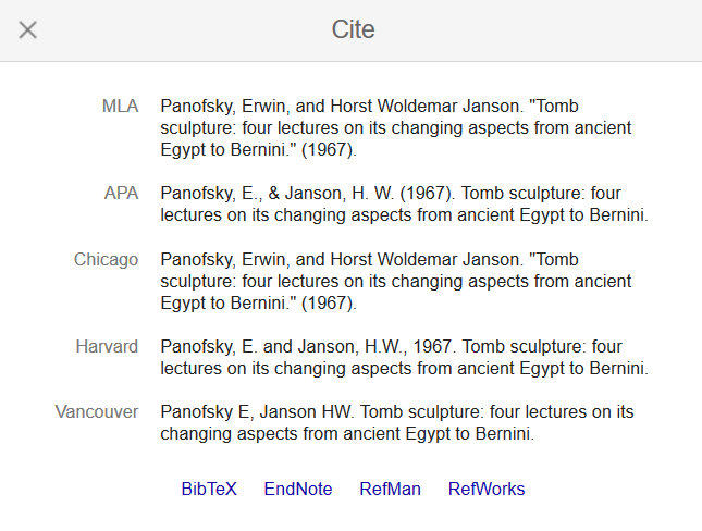 这时弹窗里就会显示这篇论文的各种引用信息,包含 APA、哈佛等常见格式。有了正确的文献信息后,你还能根据需要复制粘贴。结合前面讲到的图书馆归档功能,你会发现给项目资料分门别类会变得很轻松,想要查找某篇引用文章时也不费劲。当然了,你也可以用参考文献生成器,但谷歌学术已经能做到的,为啥还要多此一举呢?