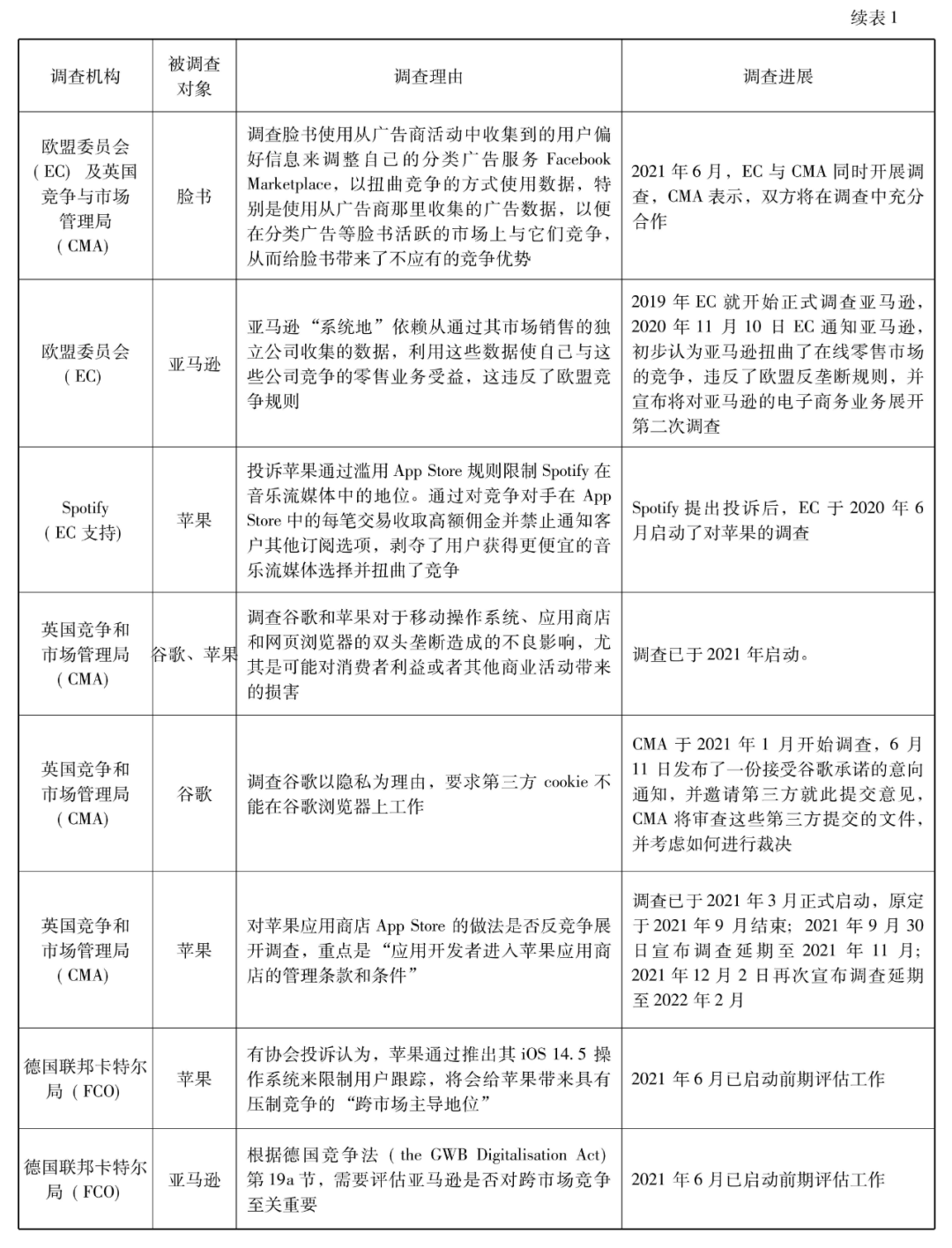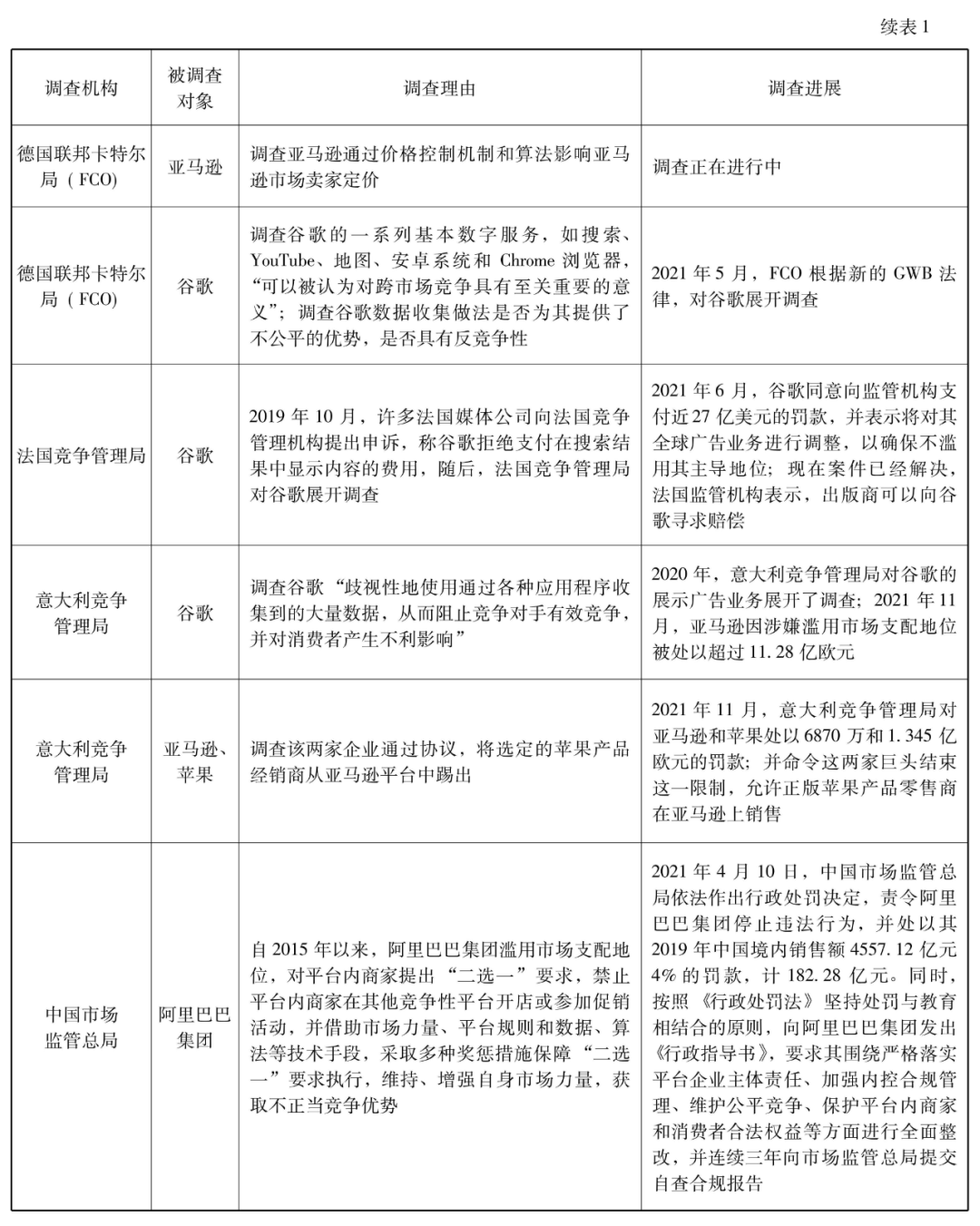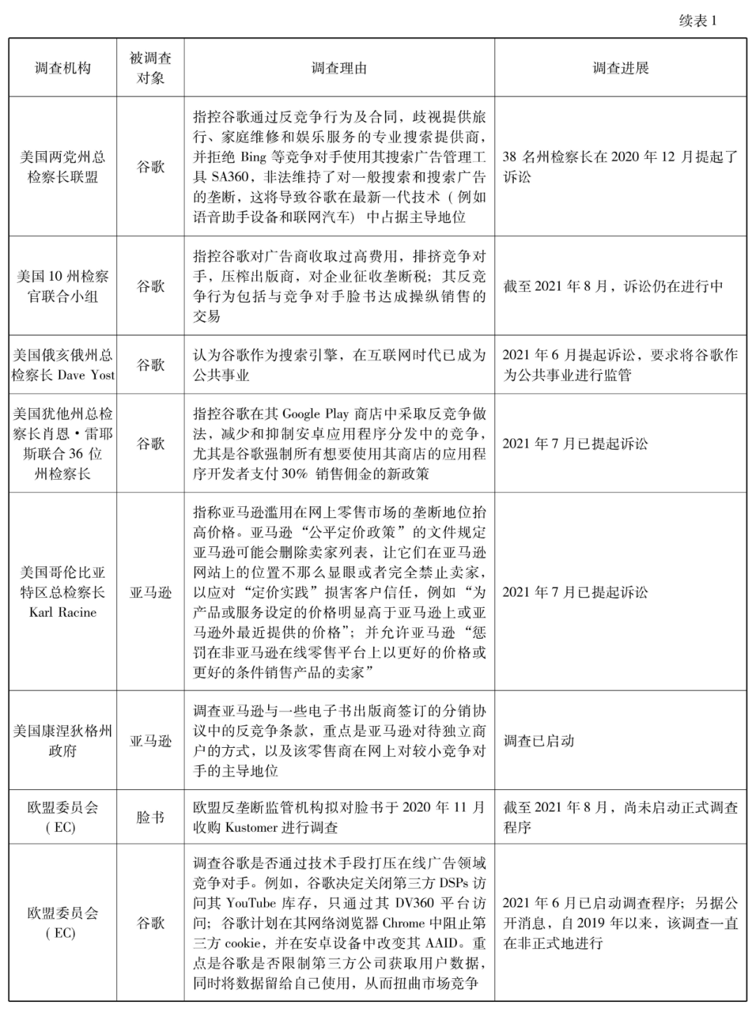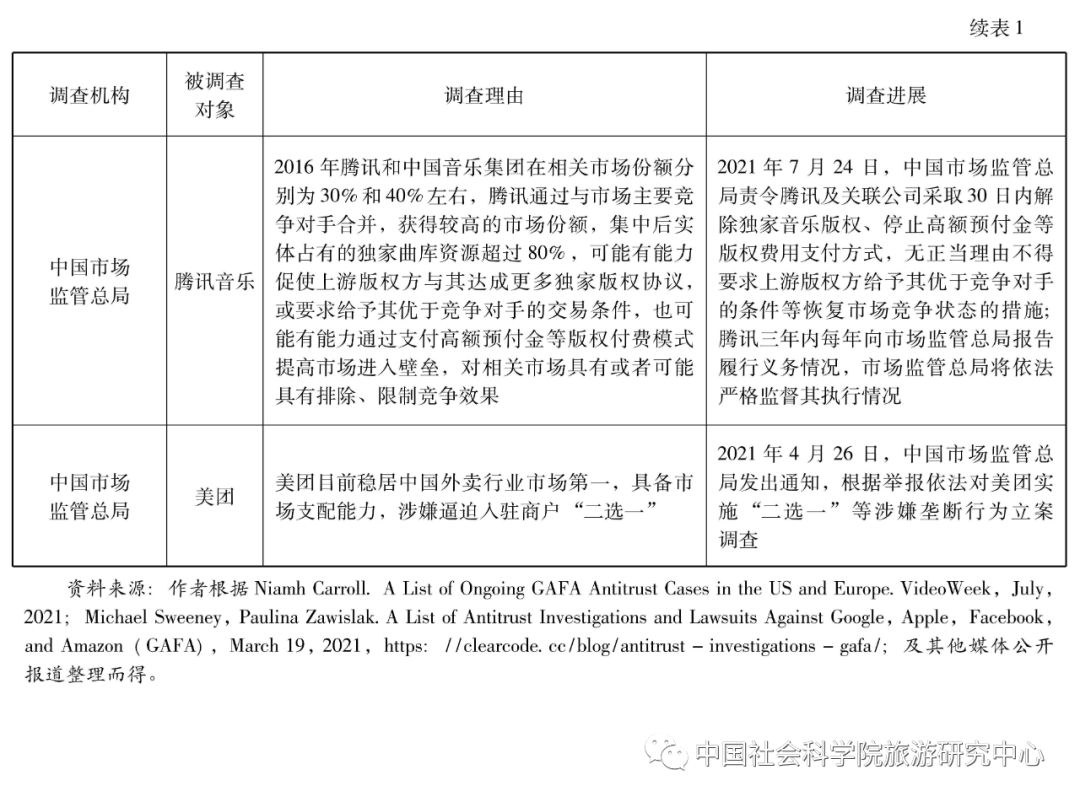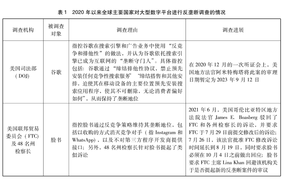 根据媒体公开报道发现,自2020年开始,针对全球重要数字经济平台的调查就有27起,其中大部分都还在调查或者起诉过程中。从这些调查或诉讼的重点来看,涉及到反竞争行为。例如,美国司法部起诉谷歌的一个重要理由是谷歌在搜索引擎和广告业务中使用预先安装、禁止安装与其有竞争的搜索引擎、默认设置等“反竞争和排他性”的做法;中国市场监管总局调查阿里巴巴集团的理由是其进行“二选一”等反竞争行为。也涉及到不提供接口或者连通服务。例如,美国两党州总检察长联盟起诉谷歌的一个重要理由是其歧视提供旅行、家庭维修和娱乐服务的专业搜索提供商;FTC及48名州检察长起诉脸书的一个重要理由是其不对第三方程序开发商提供接口。还有一些调查涉及到数据垄断等非常前沿的问题。例如,欧盟委员会(EC)及英国竞争与市场管理局(CMA)调查脸书的理由是其以扭曲竞争的方式使用数据,特别是使用从广告商那里收集的广告数据,以便在分类广告等脸书活跃的市场上与它们竞争,从而给脸书带来了不应有的竞争优势。