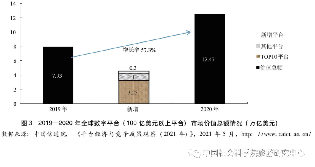 数字经济的发展带动了平台的兴起。数字平台是一种存在于数字空间的虚拟交互场所,平台利用数字技术为平台各方之间的交互提供支持。平台的快速成长已成为数字经济领域最重要的现象。截至2021年6月30日,全球市值最高的10家企业中,有7家是数字平台型企业,这些企业的市值接近9万亿美元。而这些企业中更是诞生了至少2家有史以来市值首次超过2万亿美元的企业(苹果和微软)。另据统计,截至2020年底,全球市场价值超100亿美元的数字平台企业达76家,价值总额达12.5万亿美元,同比增速达57%(见图3)。