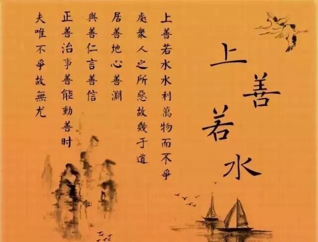 上善若水,语出《老子》:“上善若水,水善利万物而不争,处众人之所恶(wù),故几于道。”意思是说,最高境界的善行就像水的品性一样,泽被万物而不争名利,处于众人所不注意的地方,所以是最接近道的。在道家学说里,水为至善至柔;水性绵绵密密,微则无声,巨则汹涌;与人无争却又容纳万物。人生之道,莫过于此。
