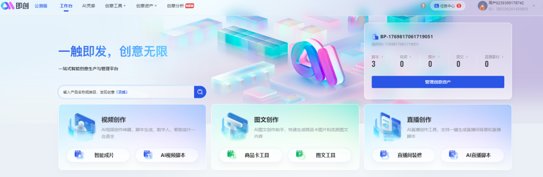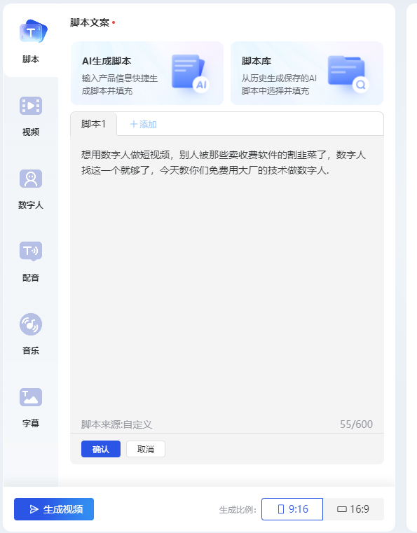 首先打开即创这个AI数字人网站,点击智能成片,会看到输入脚本的输入框,有自己准备好的文案可以直接输入上去,没有的可以点击AI生成脚本,输入卖点和优惠信息进行生成,放入文案之后点击确认: