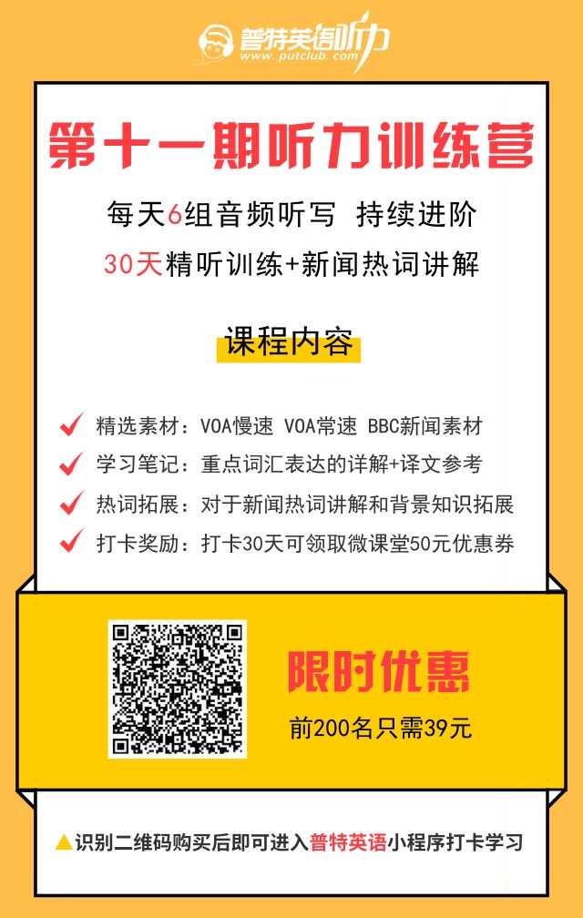 关注普特的小伙伴们都知道普特一直开设听力训练营来和大家一起坚持练习听力,那第十一期听力训练营(30天听力进阶训练)开始报名啦!前200名只需39元!