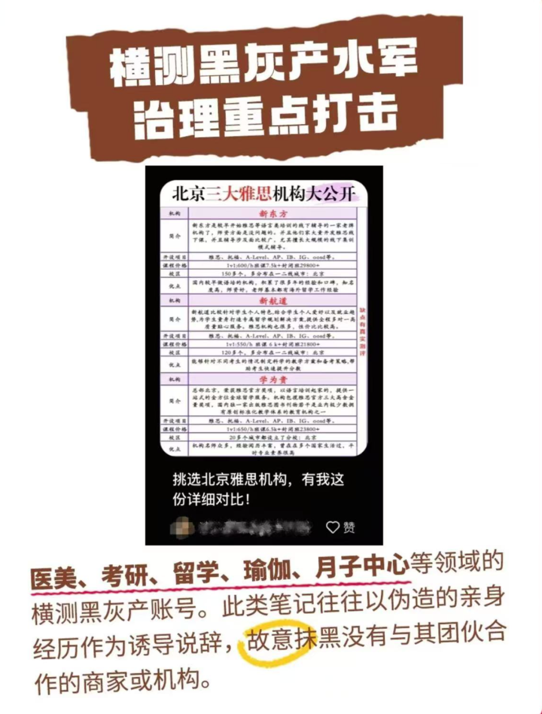 本次治理将重点锚定医美、考研、留学、瑜伽、月子中心等领域的横测黑灰产账号进行打击。