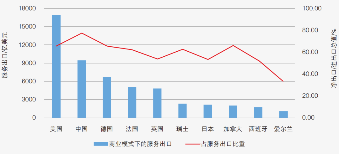 ICT服务是过去十年我国数字服务出口占比提升最快、增长贡献最大的领域。ICT服务、知识产权服务是知识密集型行业,是国家支持发展的优先领域。2011-2020年,我国ICT服务在数字服务出口中占比提升了19.7个百分点。目前,中国已成为全球最大PCT国际专利申请来源国,5G、区块链、人工智能等领域专利申请量全球第一,涌现出一大批具有国际竞争力的ICT企业。3.商业存在模式下,我国数字服务贸易具有较大发展空间出口规模大、占比高。近年来,我国对外投资合作持续提升。根据2021年WT0最新发布的商业存在服务贸易数据,2018年通过商业存在模式出口的服务达到9483.3亿美元,在提供商业存在数据的30个国家中排名第2,仅次于美国;在当年服务出口中的占比超过7成,同样居于前列(图4)。图4 2018年中国商业存在模式下的服务出口和占比资料来源:WTO基础数据和课题组计算。