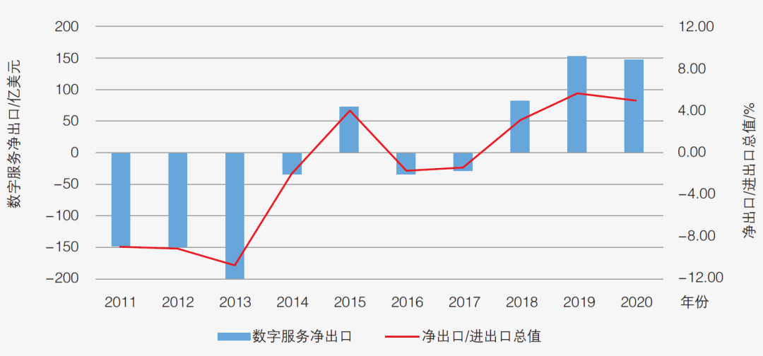 国际竞争力持续增强。从顺逆差看,经过十年国际化创新发展,我国数字服务海外市场取得巨大突破,数字服务贸易净出口额从2011年的逆差148.2亿美元逐渐扭转为顺差,2018年到2020年已连续3年实现顺差,国际竞争力持续增强。2020年,我国数字服务贸易顺差为147.7亿美元,贸易竞争力指数(净出口与进出口总值之比)为5%,与2019年基本持平(图2)。图2 2011-2020年中国数字服务贸易平衡和竞争力指数资料来源:UNCTAD基础数据、课题组计算和商务部发布信息。