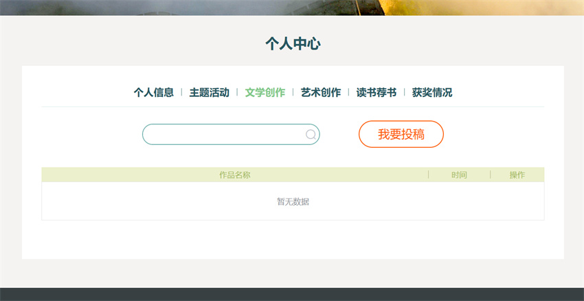 6.用户若需要投稿文学作品创作,选择“文学创作”菜单,点击“我要投稿”新增作品,输入作品标题和作品内容后点击提交,指导教师为非必填项。提交后用户也可随时点击操作按钮进行作品查看、修改或删除。