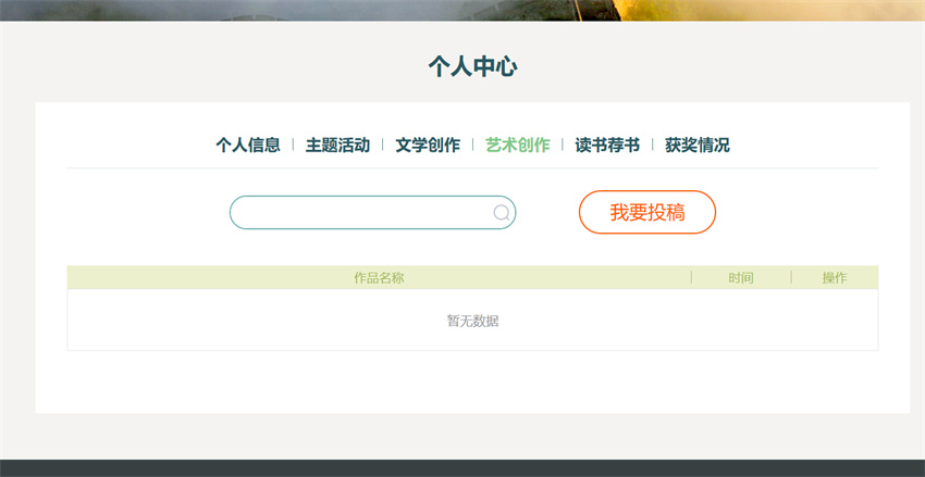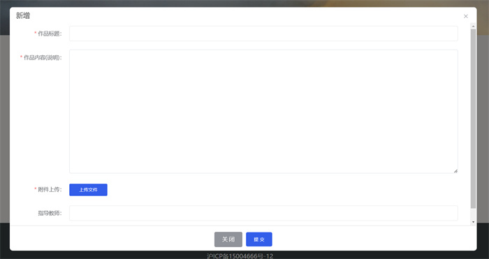 7.用户若需要投稿艺术作品创作,选择“艺术创作”菜单,点击“我要投稿”新增作品,输入作品标题和作品内容,并上传作品照片附件后点击提交,指导教师为非必填项。请注意,附件照片仅限jpg、jpeg格式,照片大小5M以内。提交后用户也可随时点击操作按钮进行作品查看、修改或删除