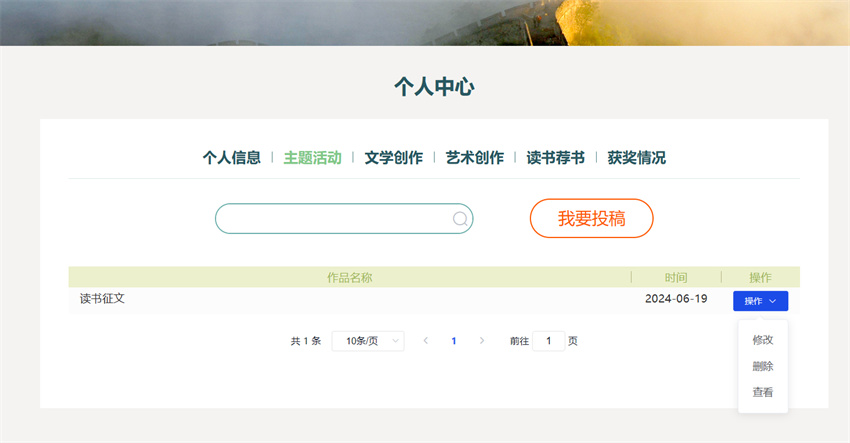 5.用户若需要投稿读书征文活动,选择“主题活动”菜单,点击“我要投稿”新增作品,输入作品标题和作品内容后点击提交,指导教师为非必填项。提交后用户也可随时点击操作按钮进行作品查看、修改或删除。