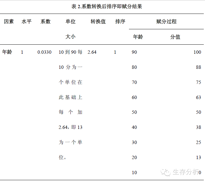 对于连续性变量年龄,其范围是10-90,结合表1中估计的各因素的系数,Nomogram的转换公式是: