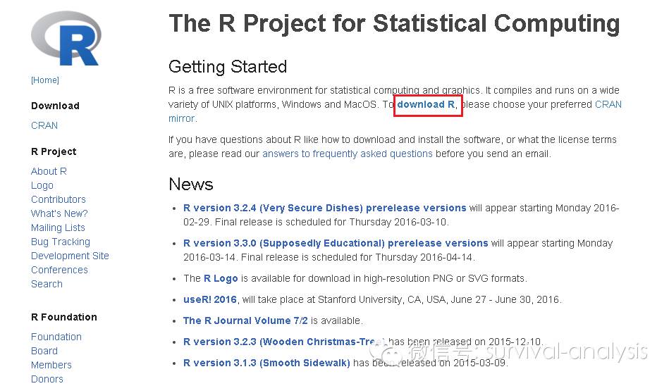 2.在首页第一部分Getting Started的第一段找到download R ,蓝色字体突出显示的,很容易看到点击download R