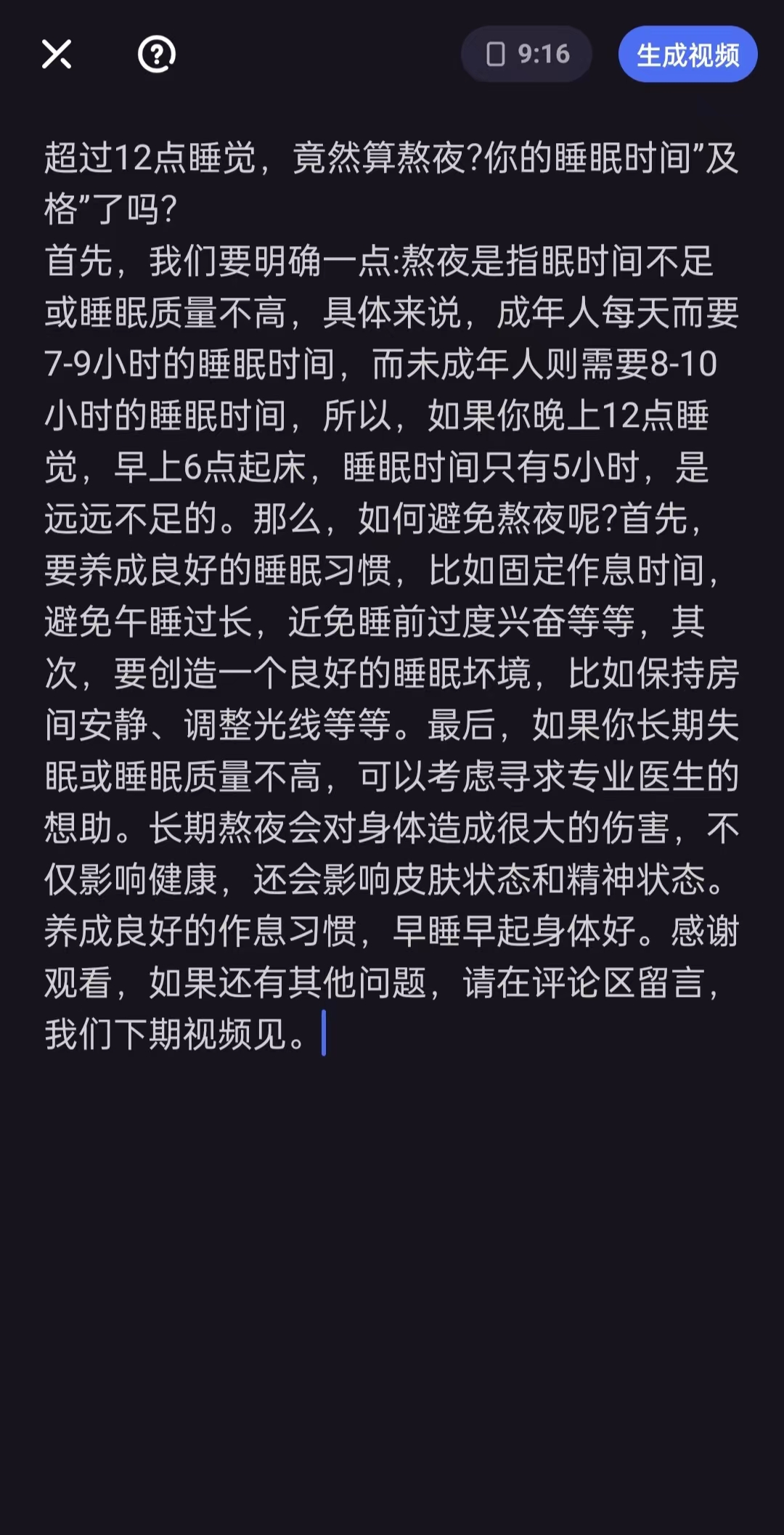 剪映生成的文案逻辑性和完整性略显不足,缺少了对熬夜的定义、危害和相关建议,提到了睡眠的作用和助眠方法。对问题核心没有给出正面回答,文案可用性有限。