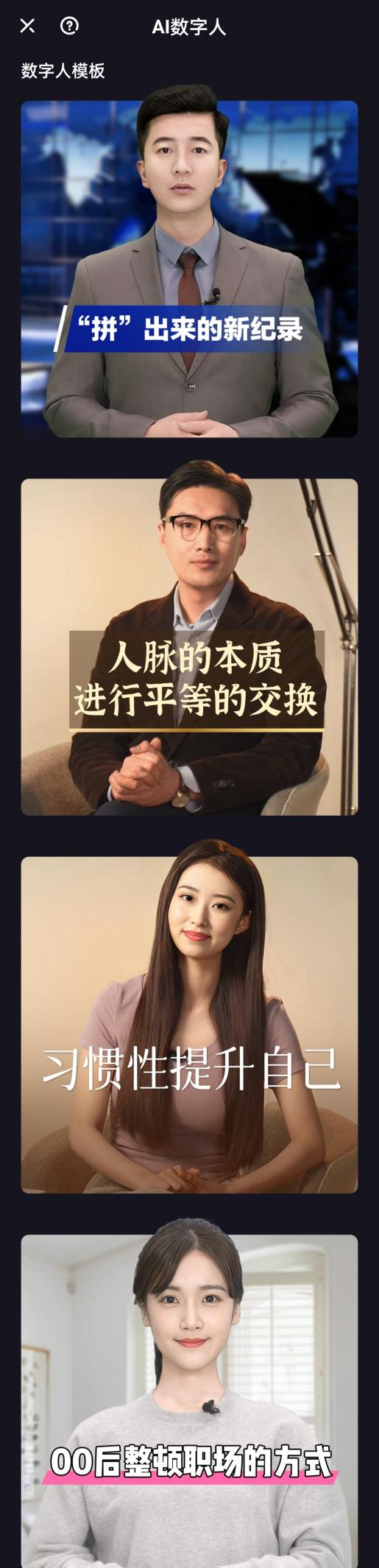 剪映的数字人生成功能有一定自由度,有4个人物15个模板,支持更换数字人景别、背景,也支持在一个视频中使用多个数字人形象。