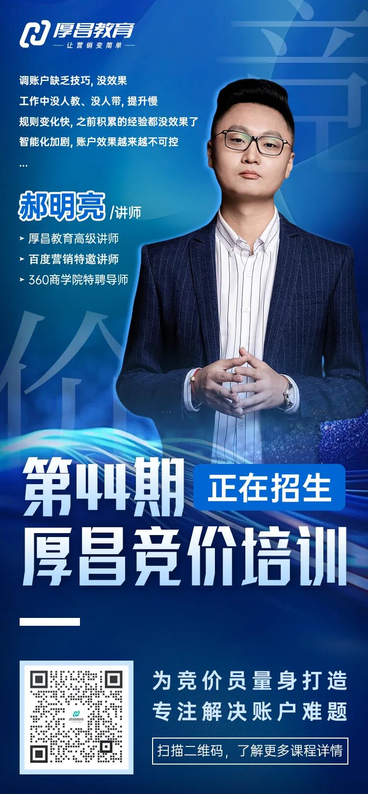 郝明亮老师,厚昌教育的金牌讲师,具备9年竞价推广经验,是百度营销星火营特邀讲师,同时也是360商学院的特邀讲师,每年都会为360公司全国的竞价员进行内部培训,曾指导零基础学员仅花213元推广费用,完成152万业绩;指导学员账户线索提升10倍。