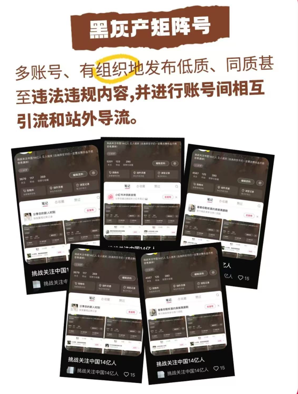 小红书致力建设真实美好、安全有序的社区生态,尊重和保障广大用户的合法权益。但有黑灰产组织以多账号(团伙)形式,有组织地发布大量虚假横向测评,或发布大量低质量、同质化甚至违法、违规内容且相互引流和向站外导流,并试图逃避平台管理与处罚,不当获利。这严重伤害用户体验,损害正常经营的品牌和商家利益,扰乱社区秩序。