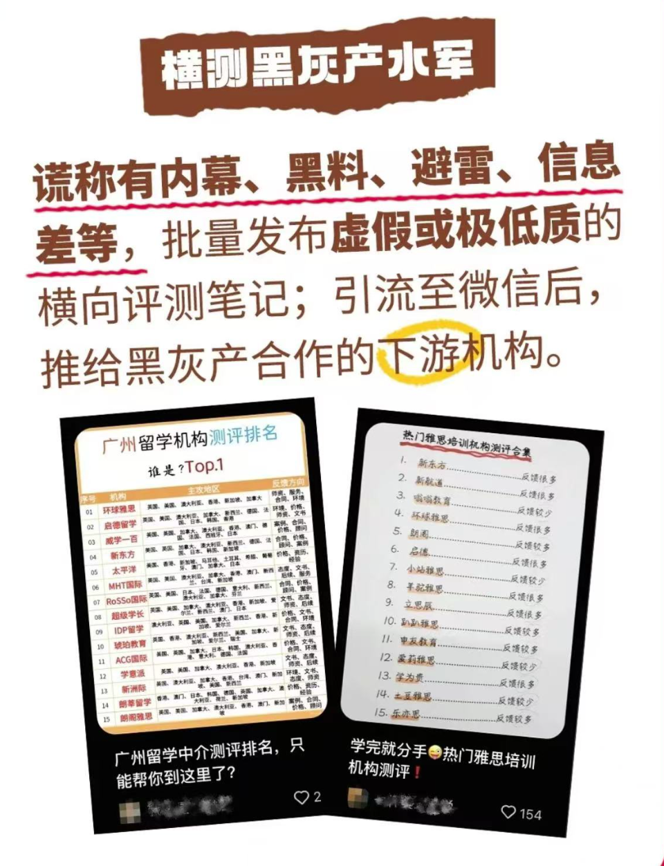 方向一:对横向测评黑灰产水军的打击这类黑灰产往往谎称有内幕、黑料、避雷信息等,以此为噱头,在站内孵化数以千计的测评账号,批量发布虚假或极低质的横向评测笔记,向站外引流,并再推荐给黑灰产合作的下游机构。此类横向测评笔记中的信息和评价几乎没有事实依据,也并非亲身体验,且往往故意抹黑没有与横测黑灰产团伙合作的商家或机构。
